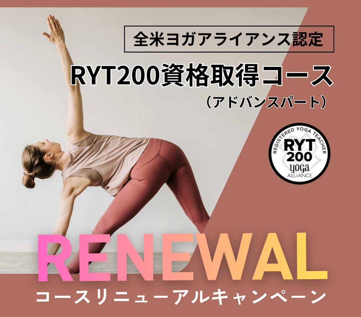 ヨガベーシックコースご卒業後、アドバンスコースをご卒業いただくことで、全米ヨガアライアンス認定資格(RYT200)取得できます。