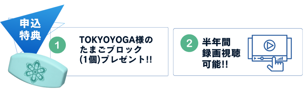 | お申込特典 | 今回のみの特典①TOKYOYOGA様のたまごブロック(1個)プレゼント!②半年間録画視聴可能!![]() |